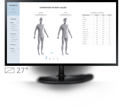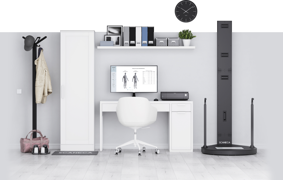 A SCANECA segítségével első pillantásra észlelheti a testtartási problémákat. A lábak terheléseloszlása és a legfontosabb távolságok és szögek automatikusan meghatározásra kerülnek.
